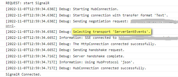 Details des Verbindungsaufbaus sieht man in der F12 Developer Konsole. Insbesondere erkennt man, welche Transport-Art von SignalR ausgewählt wurde: